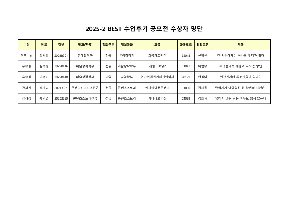 또한 2025-1학기 BEST 수업후기 공모전 수상작도 게시되어 있으니, 이번 수강신청에 활용하시기 바랍니다.